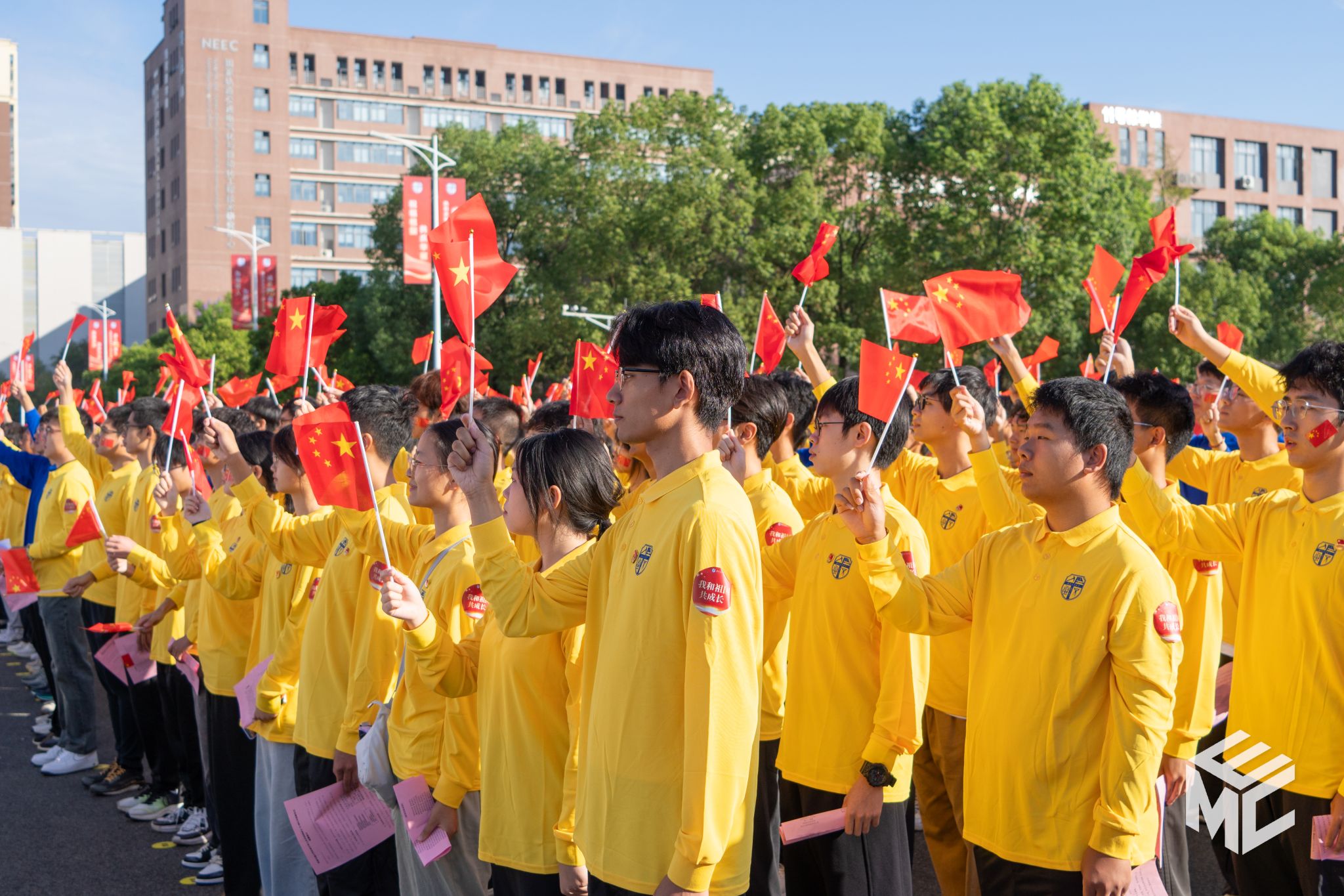 升国旗仪式结束后,2024年5月15日(校庆日)天安门广场升挂的国旗在学校国旗护卫队的护送下入场。观礼方阵中,学院师生满怀崇高敬意,轻柔触摸国旗,并簇拥在这面具有特殊意义的国旗四周合影留念。