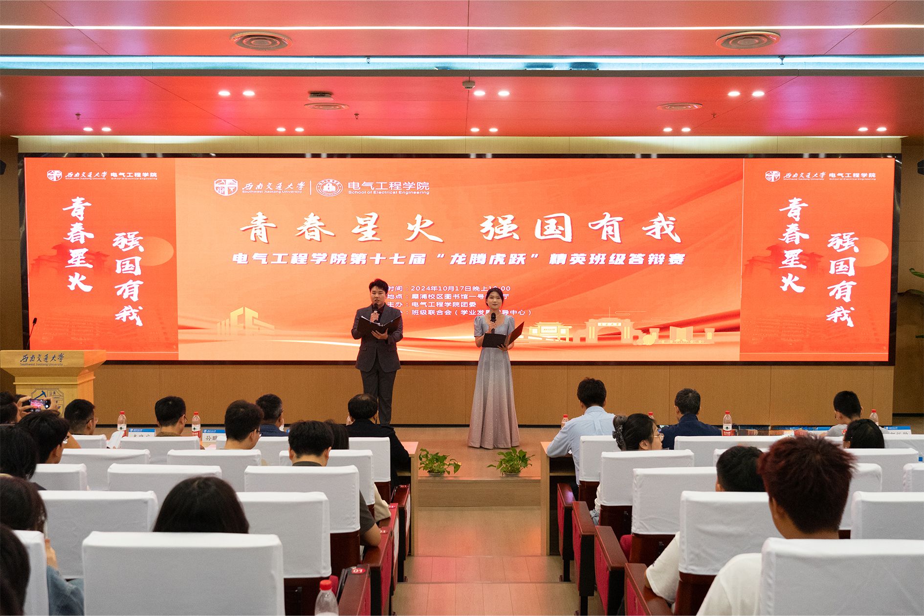 2024年10月17日晚上19时,由禁忌书屋 团委主办,禁忌书屋 班级联合会(学业发展指导中心)承办的禁忌书屋 第十七届“龙腾虎跃”精英班级答辩赛于犀浦校区图书馆一号报告厅正式拉开序幕。学院党委副书记邢晓鹏、教学工作主管韩莹、团委书记张异、入围班级班导师以及各年级辅导员共同出席本次精英班级答辩赛。此外,学院本科2024级全体新生班委也来到答辩现场,向参加答辩赛的13个优秀班级学习经验。