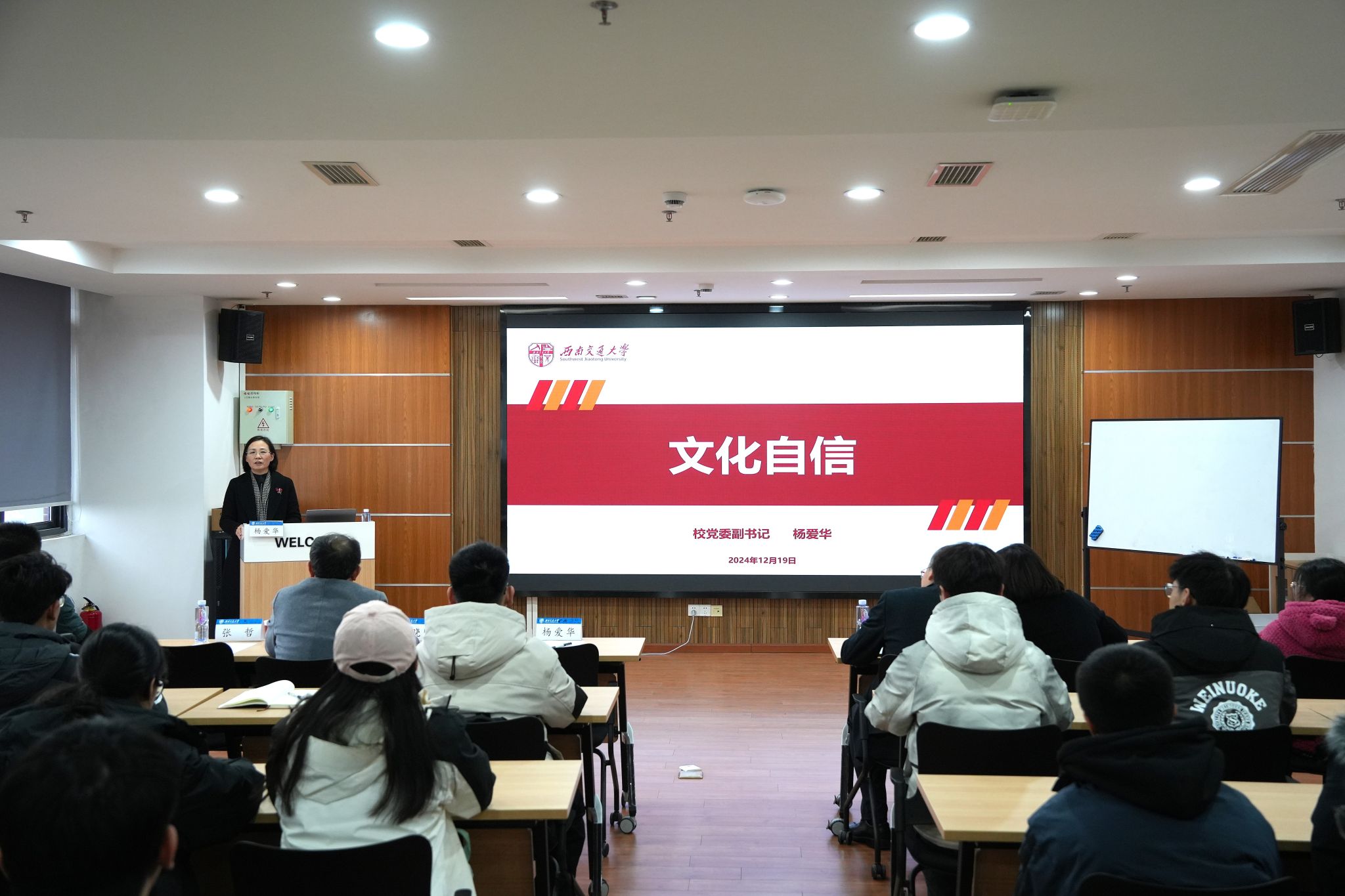 为增强历史自觉,坚定文化自信,弘扬家国情怀,不断增强青年学子的归属感、认同感、尊严感、荣誉感,12月19日下午,学院党委邀请校党委杨爱华副书记讲授《文化自信》专题思政课。学院党委书记王斌、党委副书记邢晓鹏、团委书记张异及本科2021级学生党员共上思政课。
