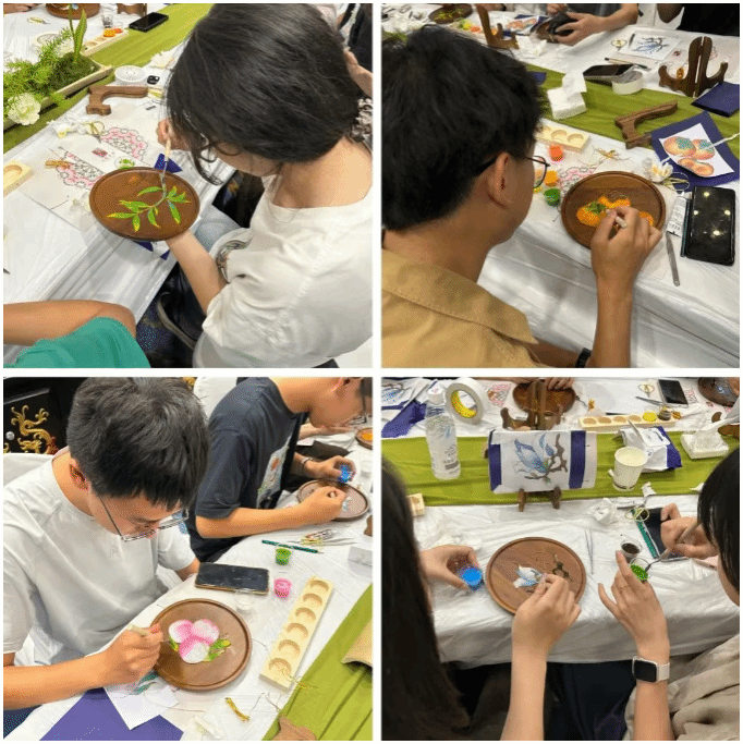 随后,老师现场演示了两项技艺的核心步骤:从点翠的羽毛筛选、精巧粘贴到呈现的独特光泽,再到掐丝珐琅的金属丝弯折、固定以及釉料填充的关键技巧,近距离感受着指尖上的非遗智慧与传统美学的震撼。