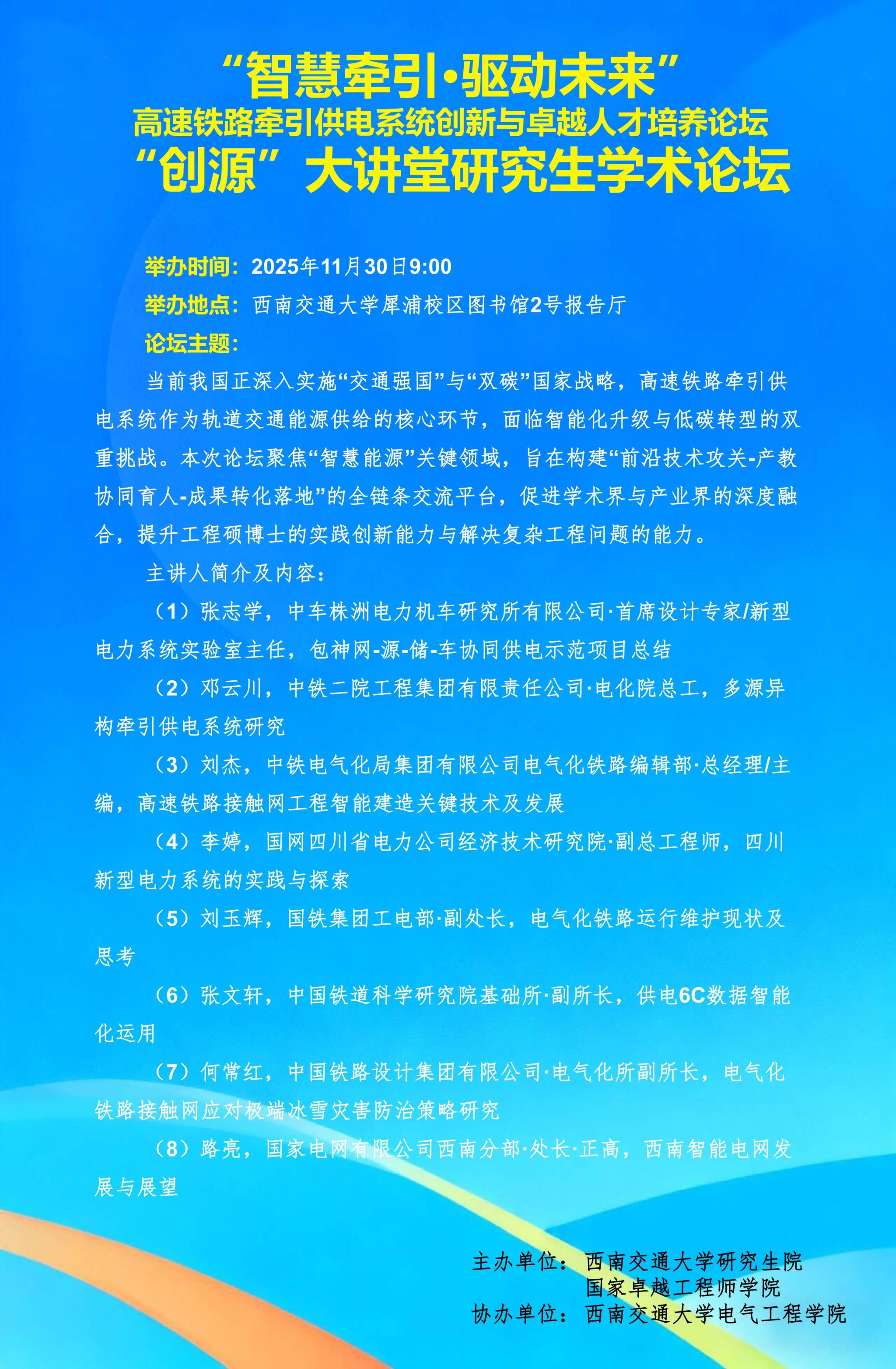 当前我国正深入实施“交通强国”与“双碳”国家战略,高速铁路牵引供电系统作为轨道交通能源供给的核心环节,面临智能化升级与低碳转型的双重挑战。本次论坛聚焦“智慧能源”关键领域,旨在构建“前沿技术攻关-产教协同育人-成果转化落地”的全链条交流平台,促进学术界与产业界的深度融合,提升工程硕博士的实践创新能力与解决复杂工程问题的能力。